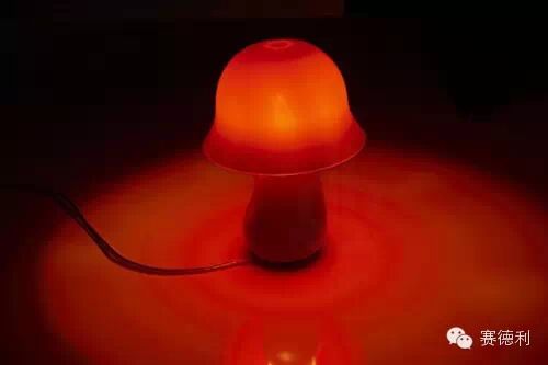 这款蘑菇灯是吹制玻璃做成的, 意大利工匠手工制作而成。它小巧可爱,给我们压抑严肃的周围环境添加了温馨和活泼。它有着不同的色彩,而且还有着不同的玻璃灯罩,不同的灯罩反射出不同的光线,用户可以根据心情随时改变它。身体和灯罩可以随意进行不同的颜色组合。